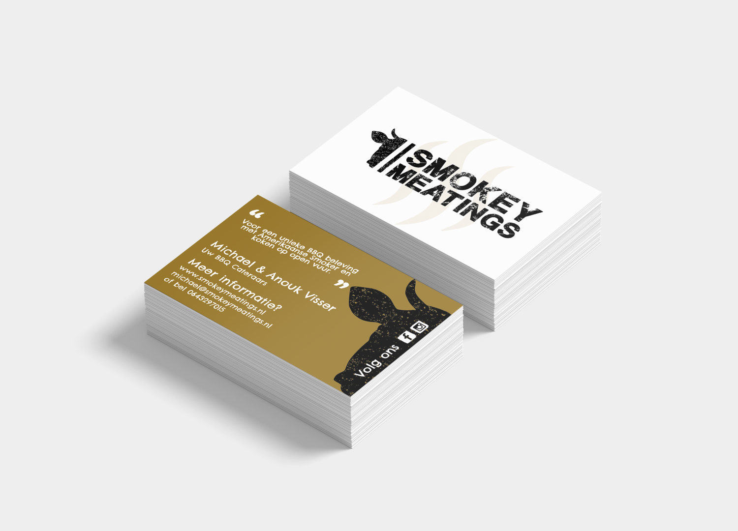 Wij ontworpen een pakkende visuele identiteit die dit verhaal vertelt. Als inspiratie namen we het zwart van de rook, ofwel smokey, in combinatie met het goudbruin zorgt dit voor een stoere maar tegelijk ook luxe uitstraling.  De grote en robuuste stierenkop refereert aan vlees en het slagersvak. Het gaat immers niet om zomaar een BBQ cateraar, maar een met jarenlange ervaring.