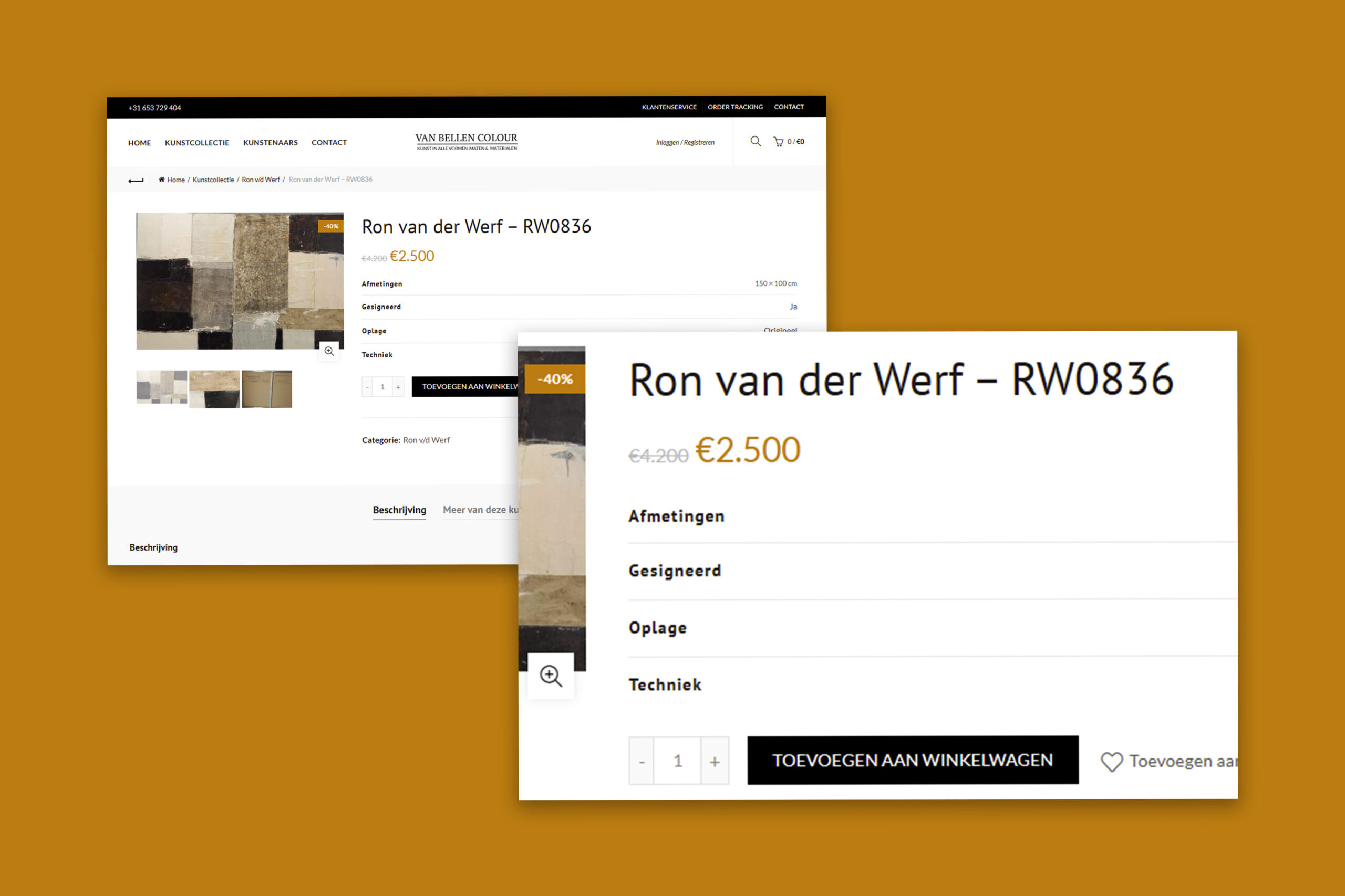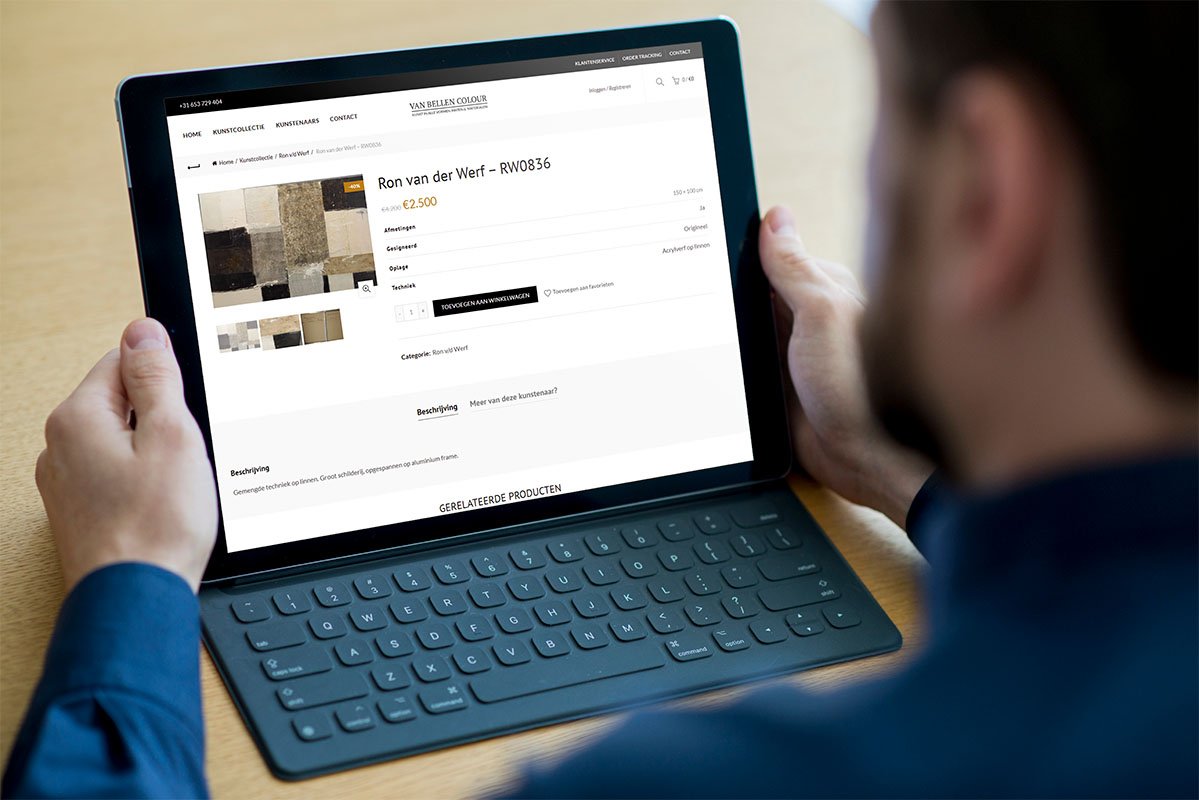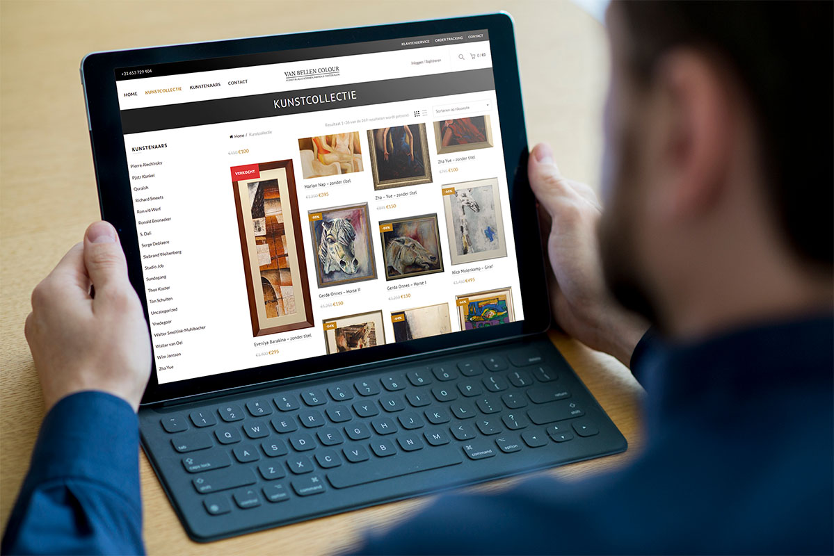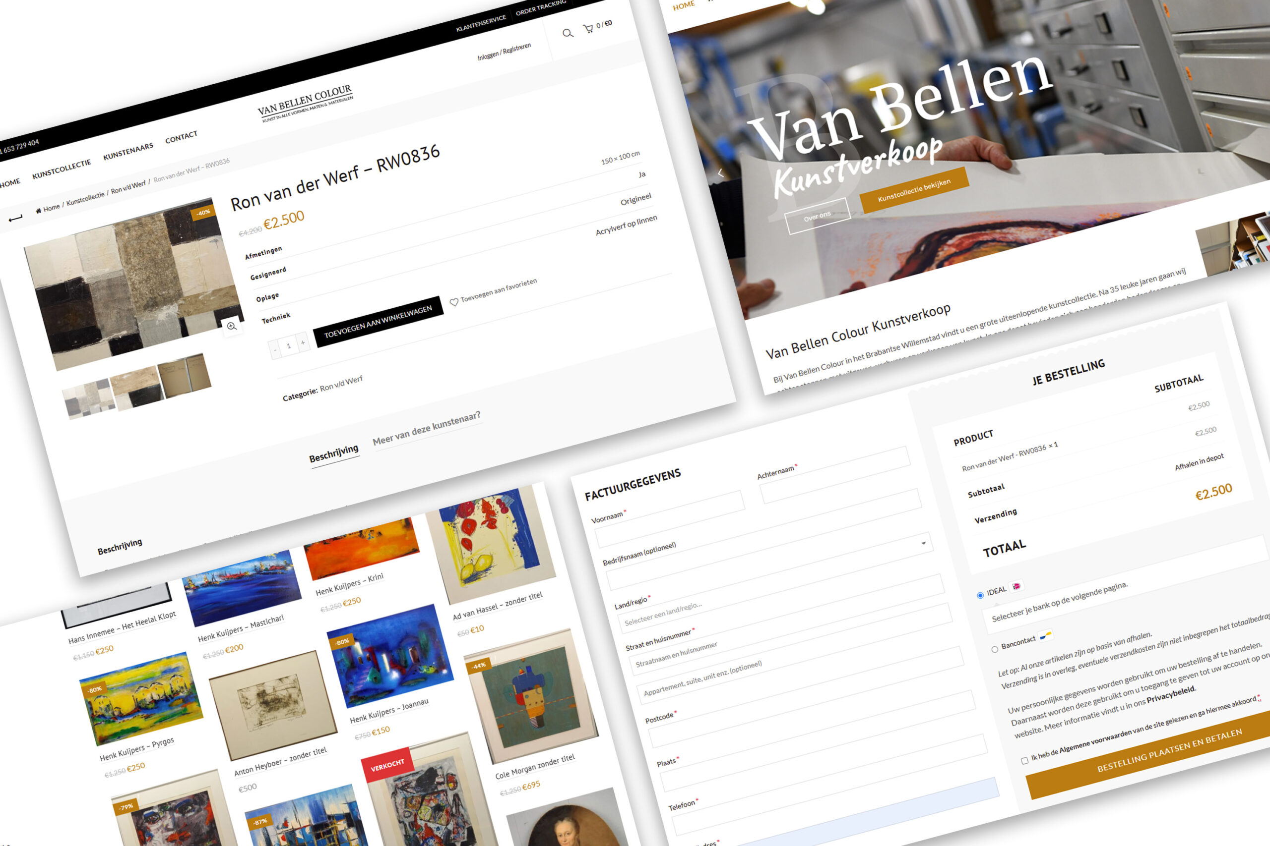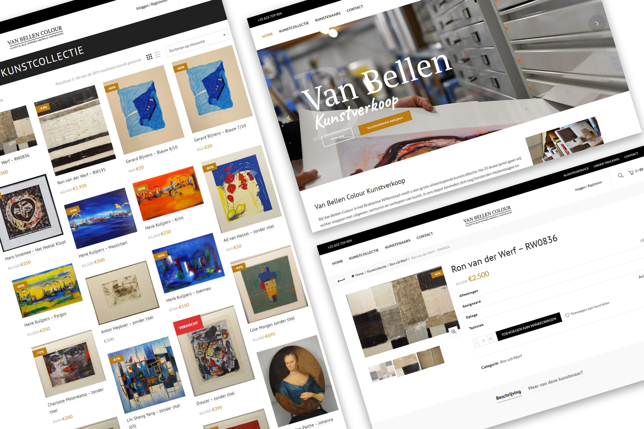 Van Bellen Colour, een bekende naam in de kunstwereld. Maar een eigen webshop hadden ze nog niet. Bij van Bellen houd men zich al 35 jaar bezig met uitgeven, verhuren en verkopen van kunst. Dat heeft geresulteerd in een depot met duizenden hedendaagse en moderne kunstwerken. De nieuwe webshop bied volop mogelijkheden om de collectie online te verkopen. Tegelijkertijd is een mooi bijkomend voordeel dat alle kunstwerken nu ook direct gearchiveerd zijn, en prijsinformatie altijd bij de hand is.